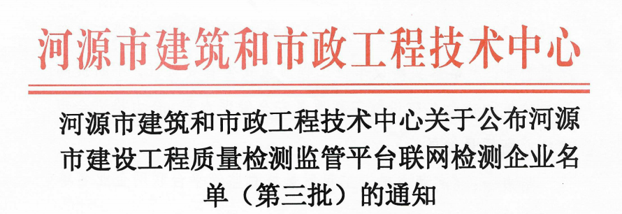 公司成功获批河源市建设工程质量检测监管平台联网检测企业